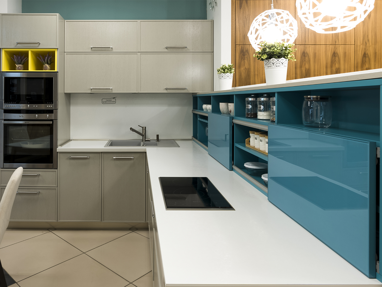 Открытые полки:  МДФ в матовой эмали с 2-х сторон. Цвета RAL 1018 жёлтый, RAL 5018 бирюзово-синий